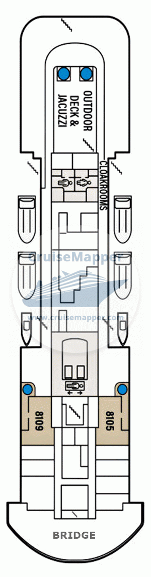 Deck 8 has only two passenger staterooms (category "Presidential Suite"/cabins #8105 and #8109) each sized 45 m2 (485 ft2) plus the private outdoor terrace (15 m2 / 160 ft2) with Jacuzzi.
