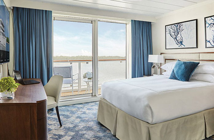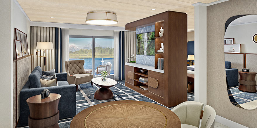 The Signature Suite (ACL's first of its kind) is located forward on Deck 4 (above the Wheelhouse/Navigation Bridge). This is a bow-facing, two-room accommodation (with a separate living room and bedroom) offering 180-degree unobstructed views of the river and surrounding scenery. The Signature Suite also features a large wraparound terrace.