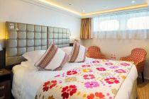 - Hotel-style queen or twin beds (200 x 160 cm) with luxury bedding, under-bed storage for suitcases, ample closet space, two long-range portable audio devices (used for land excursions), individual climate control, and 220V/110V power outlets.