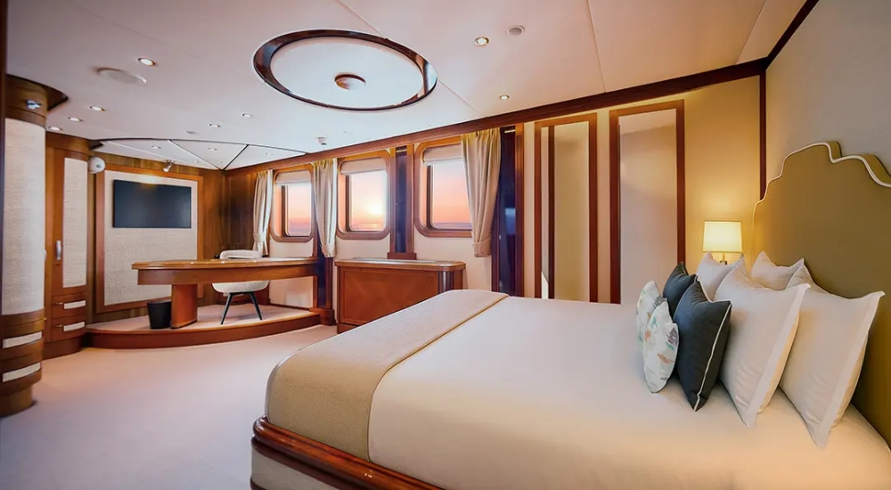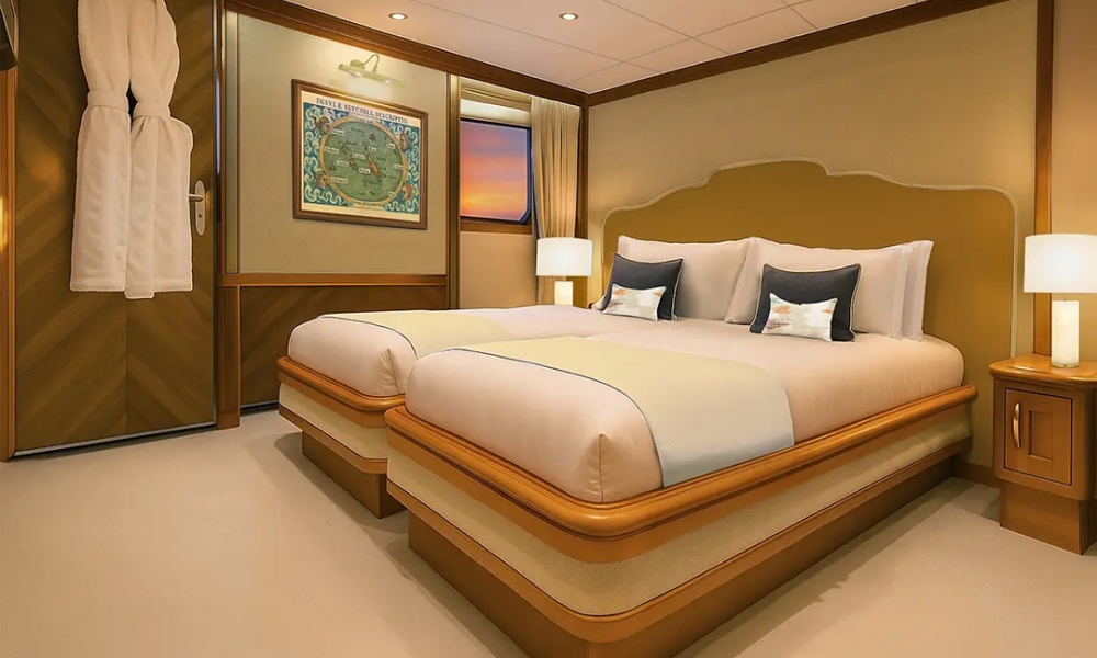 The superyacht Aqua Lares has a total of 15 staterooms, divided into 5 categories. They can be booked with double occupancy, accommodating only 35 guests on the voyage. Only the Suites allow triple occupancy (room #303, providing an additional single sofa bed) and quad occupancy (rooms #104 and #105, providing an additional double Murphy bed).