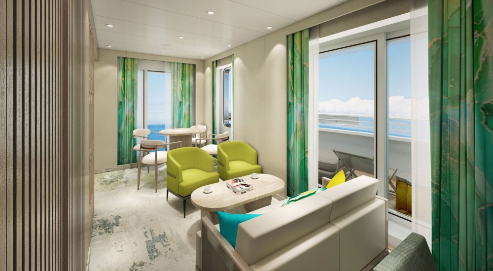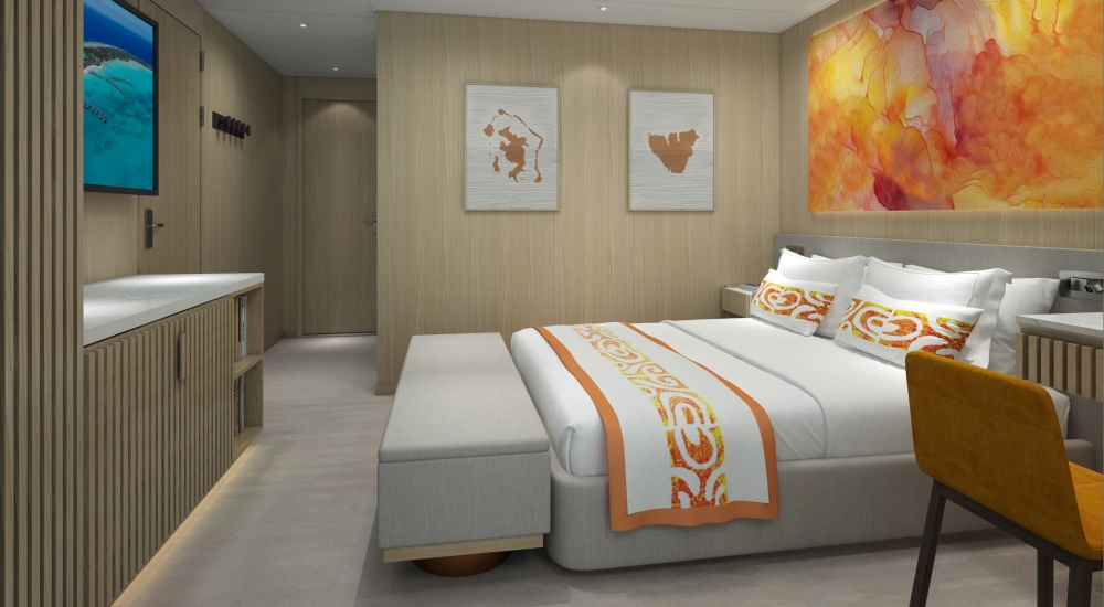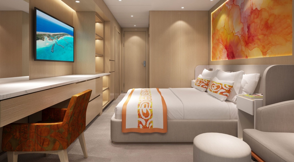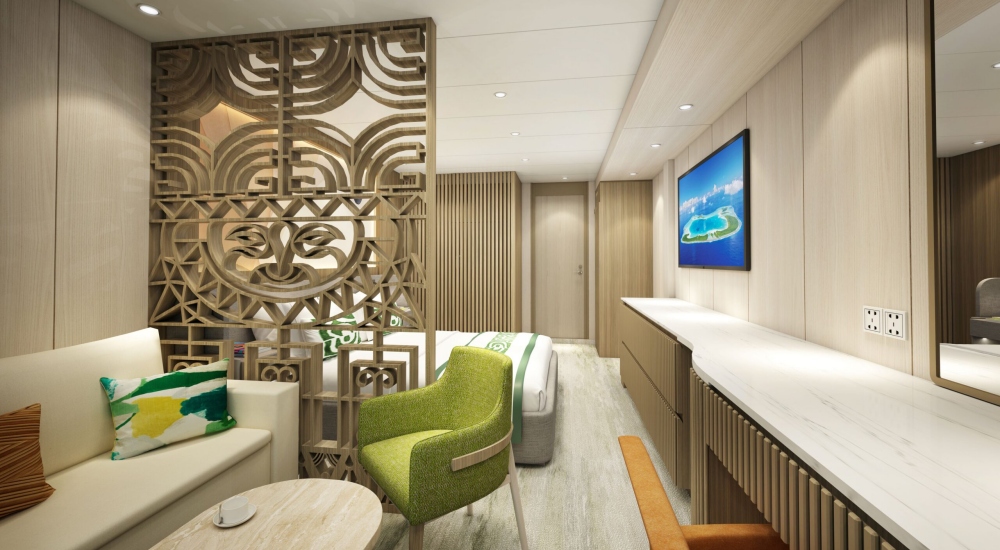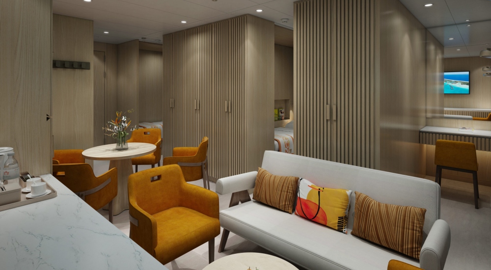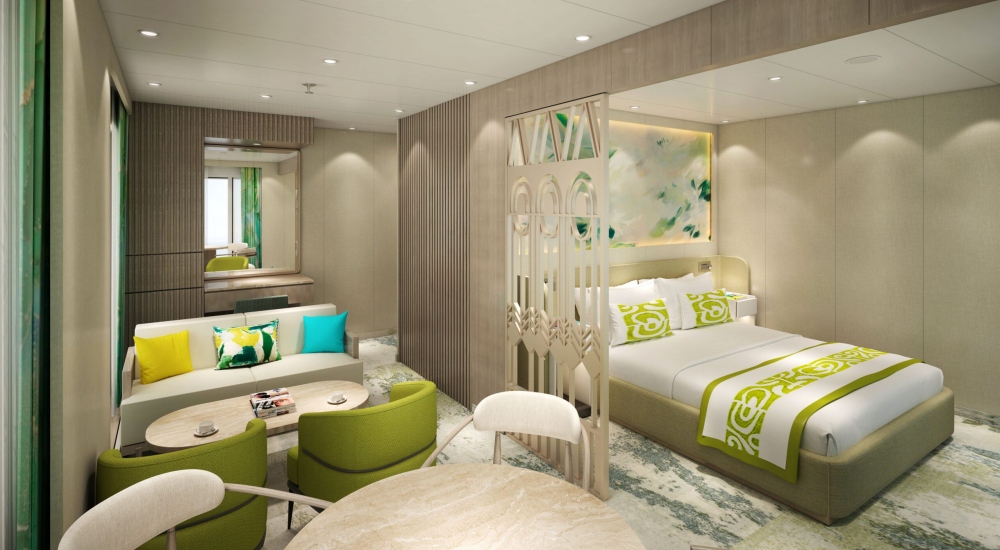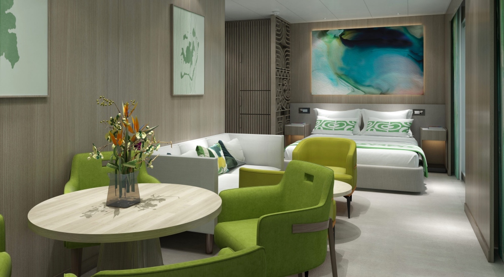 In-cabin amenities include a large HDTV, a double King-size bed (convertible to twins in most rooms), a headboard with mounted reading lamps, premium bedding, bedside tables with lighting, pillow menu (3x pillows per person), ceiling-mounted LED lighting, vanity with armchair, lounge area with sofabed (for 3rd/4th guest), coffee table, sideboard, refrigerator, electronic safe box (in the closet), en-suite bathroom (toilet, glass-enclosed shower, large mirror, single-sink vanity with under-sink storage, towels and toiletries, LED mirror, hairdryer), and individually controlled air conditioning. Larger suites include a four-seat dining table.