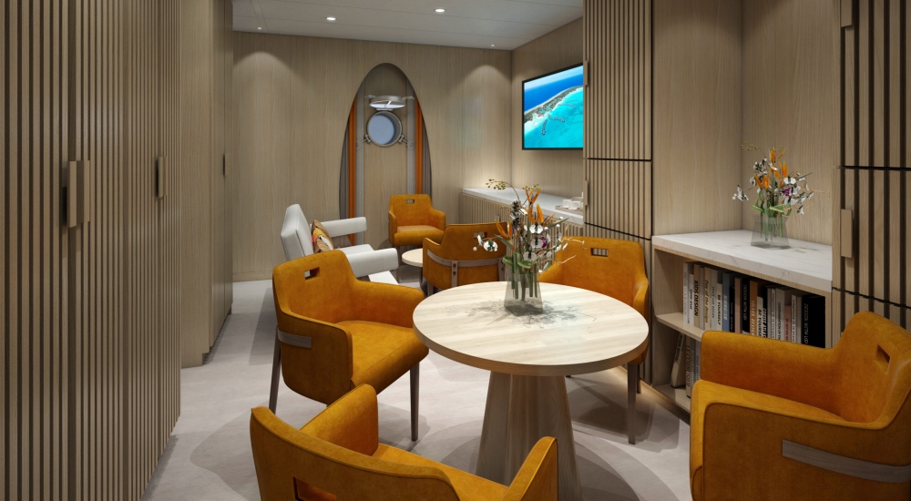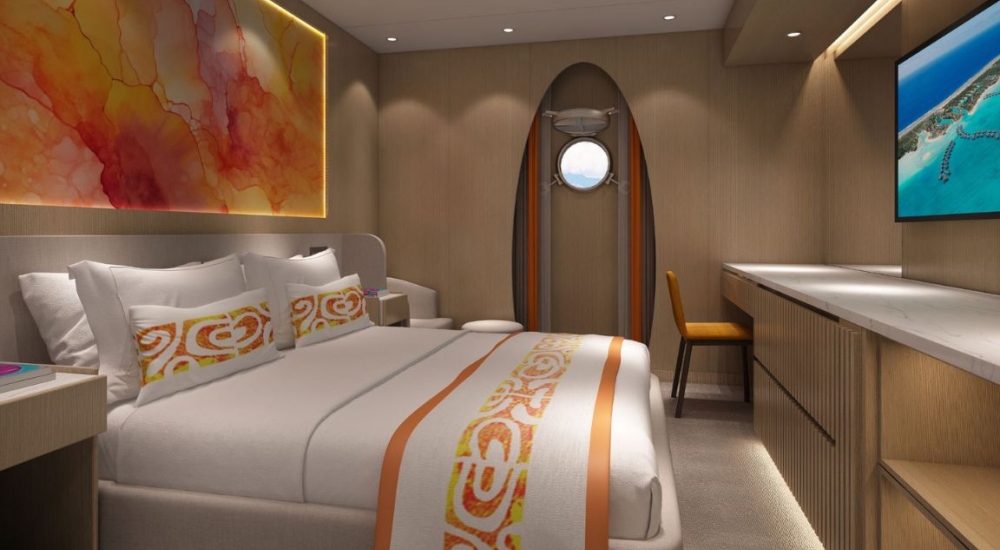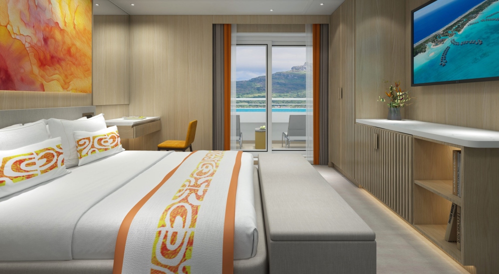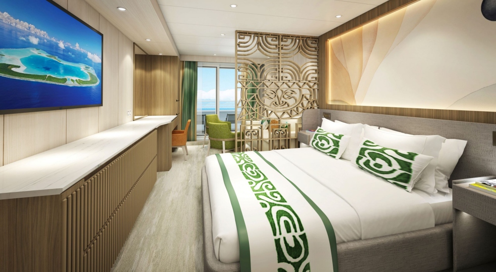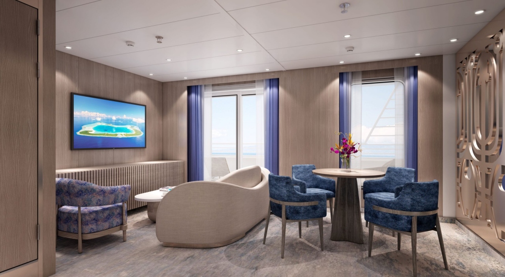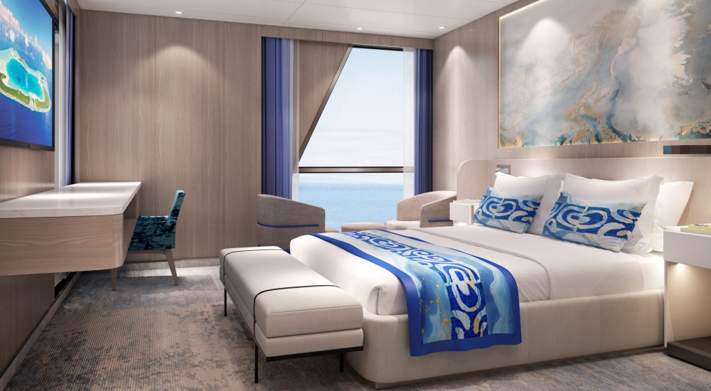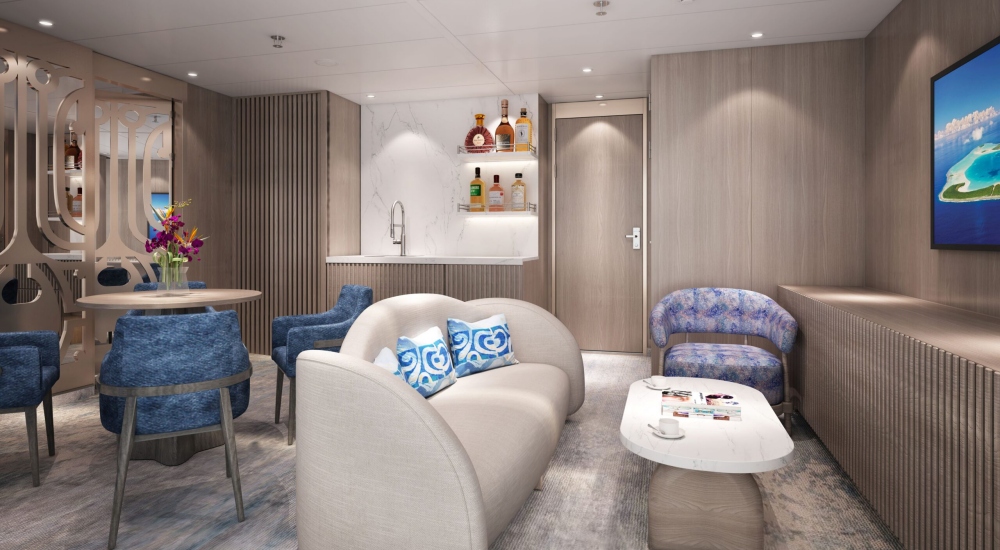 In-cabin amenities include a large HDTV, a double King-size bed (convertible to twins in most rooms), a headboard with mounted reading lamps, premium bedding, bedside tables with lighting, pillow menu (3x pillows per person), ceiling-mounted LED lighting, vanity with armchair, lounge area with sofabed (for 3rd/4th guest), coffee table, sideboard, refrigerator, electronic safe box (in the closet), en-suite bathroom (toilet, glass-enclosed shower, large mirror, single-sink vanity with under-sink storage, towels and toiletries, LED mirror, hairdryer), and individually controlled air conditioning. Larger suites include a four-seat dining table.