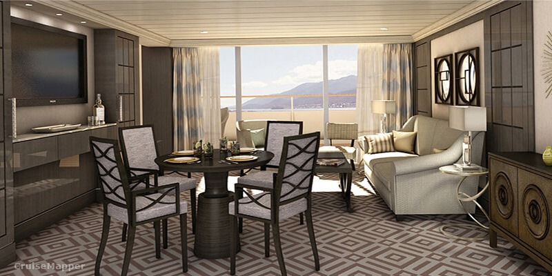 Ocean Suites (Royal Suites, forward) range from 440 to 500 ft² (41–46 m²) and have large balconies (105 to 155 ft² / 10–14 m²) furnished with a two-seat dining table and two loungers. Each suite has a separate living room (with a four-seat dining table, 55-inch TV, and floor-to-ceiling windows), a master bedroom (king-size bed, 40-inch TV, and floor-to-ceiling sliding doors), a large walk-in closet, dressing room (with mirrored vanity and chair), a marble bathroom (with jacuzzi tub and glass shower), and a guest bathroom.