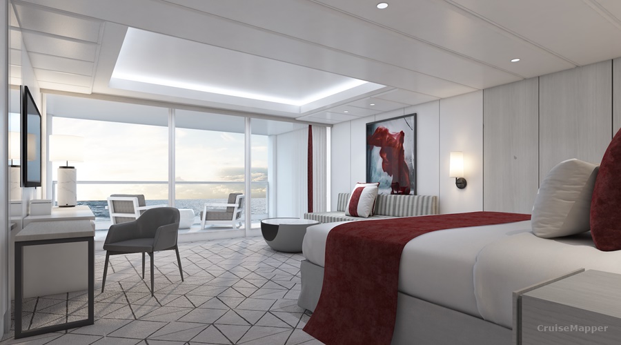 The Iconic Suite is a new addition to Celebrity Cruises' accommodation categories. Each suite features a 690 ft² (64 m²) balcony and a 1,890 ft² (176 m²) interior. Positioned above the Navigation Bridge wing, the veranda includes a whirlpool hot tub, a shaded private cabana, outdoor lounge seating, and live plants. Each suite has two bedrooms with King-sized beds, two full bathrooms, floor-to-ceiling windows, and offers 270-degree panoramic views.