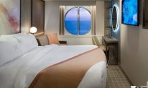 Inside Cabin amenities include King-size bed (premium mattress), mini-fridge (extra cost minibar), electronic safe (in the closet), Interactive HDTV (Internet, room service ordering, booking excursions, on-demand movies), hairdryer, bath products.