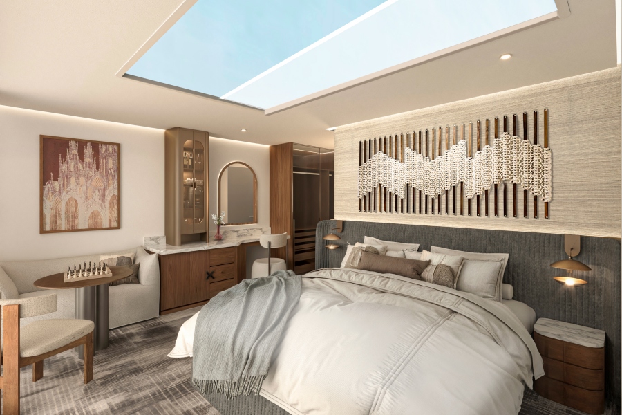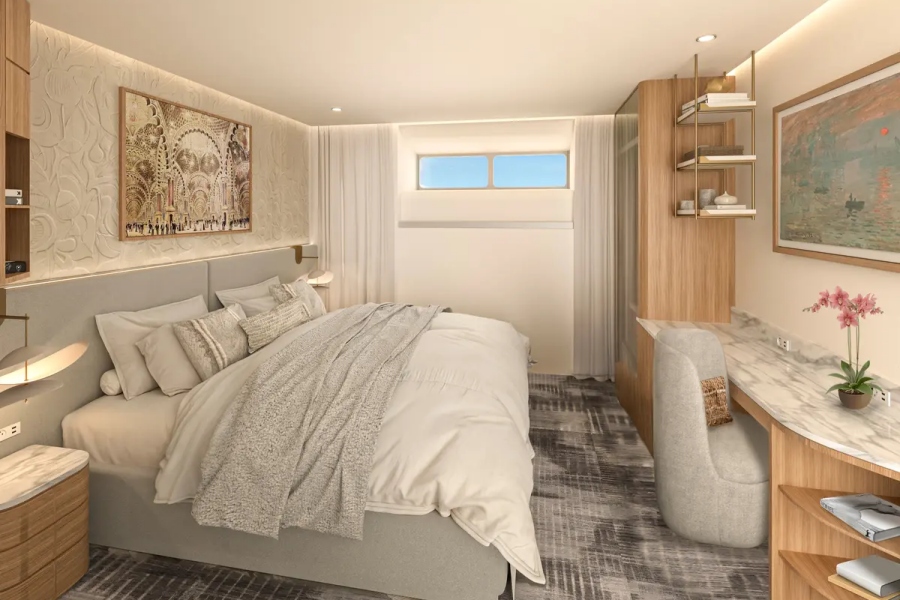 All staterooms are spacious, ranging in size between 160-260 ft2 (15-24 m2). Their interior design is marked by stylish modern furniture, neutral colors, King-sized double beds (with optional twin bed configuration), bedside cabinets (with wall-mounted reading lamps), premium linens and bedding sets (duvets, 6 pillows), complimentary mini-bars (fully stocked with beverages and pre-packaged snacks), a mirrored vanity desk (with a plush chair), wardrobe, electronic safe box (in the closet), direct-dial phone, HDTV, an oversized bathroom (toilet, single-sink vanity, hairdryer, glass shower with both handheld and rain shower heads, premium-brand bath amenities, towels, bathrobes and slippers).