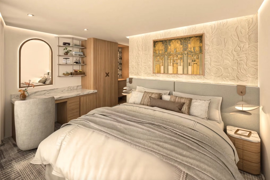 All staterooms are spacious, ranging in size between 160-260 ft2 (15-24 m2). Their interior design is marked by stylish modern furniture, neutral colors, King-sized double beds (with optional twin bed configuration), bedside cabinets (with wall-mounted reading lamps), premium linens and bedding sets (duvets, 6 pillows), complimentary mini-bars (fully stocked with beverages and pre-packaged snacks), a mirrored vanity desk (with a plush chair), wardrobe, electronic safe box (in the closet), direct-dial phone, HDTV, an oversized bathroom (toilet, single-sink vanity, hairdryer, glass shower with both handheld and rain shower heads, premium-brand bath amenities, towels, bathrobes and slippers).
