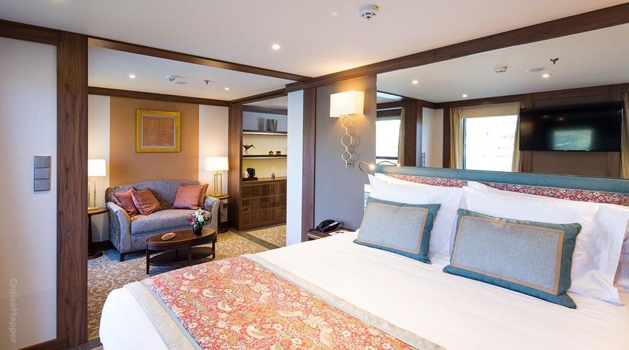 - Superior Suites (Upper Deck) measure 22 m² (235 ft²) and include a spacious living area, floor-to-ceiling windows, a step-out balcony, and a separate French Balcony with a sitting area (table and two chairs).