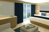 French Balcony cabins include a seating area with two armchairs. All suites feature a double bed, a larger bathroom with double-sink vanity, and a spacious seating area with a low table and two armchairs.