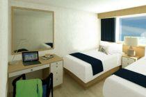 - Two lower single beds (convertible to one double), bedside cabinets with drawers, and wall-mounted reading lamps
