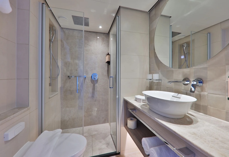 All cabin bathrooms feature marble countertops, walk-in glass showers with large rain-shower heads, and premium bath products by Crabtree and Evelyn.