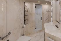 All cabin bathrooms are with heated floors, wall-hung toilets, walk-in showers, Frette plush bathrobes and linens, slippers, custom/premium brand bath toiletries, Dyson Supersonic hairdryers, single-sink vanities, LED-lighted/illuminated make-up/shaving mirrors.