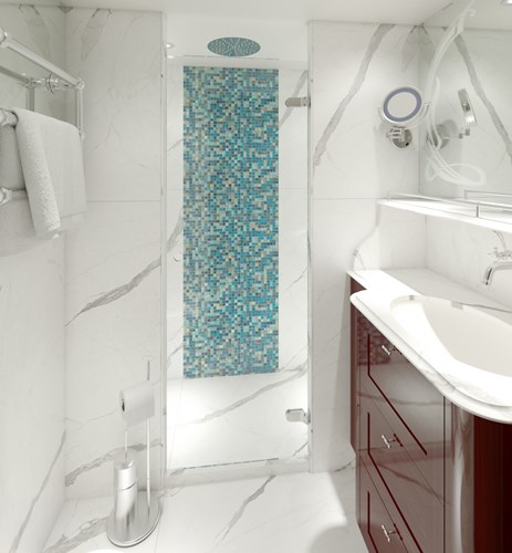 All staterooms as standard amenities offer: en-suite marble bathroom (WC, single sink mirrored vanity, shower cubicle), towel warmer, heated LED mirror, backlit magnifying mirror, hairdryer, waffle bathrobes, plush towels and slippers, luxury bath products by the Asprey brand (shampoo, conditioner, shower gel, body lotion), built-in closets, TV (with “View From the Bridge” /real-time webcam views and infotainment system), marble-top mirrored desk with chair, digital safe, hairdryer, individual climate control, 220V power outlets (European sockets only /American passengers need adapters).
