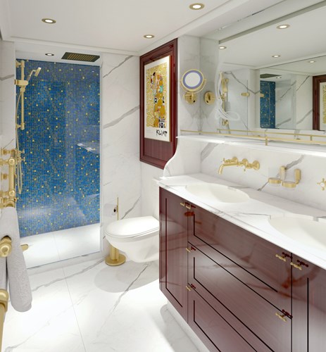 All staterooms as standard amenities offer: en-suite marble bathroom (WC, single sink mirrored vanity, shower cubicle), towel warmer, heated LED mirror, backlit magnifying mirror, hairdryer, waffle bathrobes, plush towels and slippers, luxury bath products by the Asprey brand (shampoo, conditioner, shower gel, body lotion), built-in closets, TV (with “View From the Bridge” /real-time webcam views and infotainment system), marble-top mirrored desk with chair, digital safe, hairdryer, individual climate control, 220V power outlets (European sockets only /American passengers need adapters).