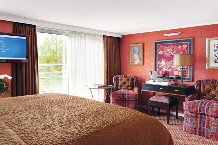Trafalgar Reverie cabins and suites review at CruiseMapper provides detailed information on cruise accommodations, including floor plans, photos, room types and categories, cabin sizes, furniture details and included by Trafalgar River Cruises (Uniworld) en-suite amenities and services.