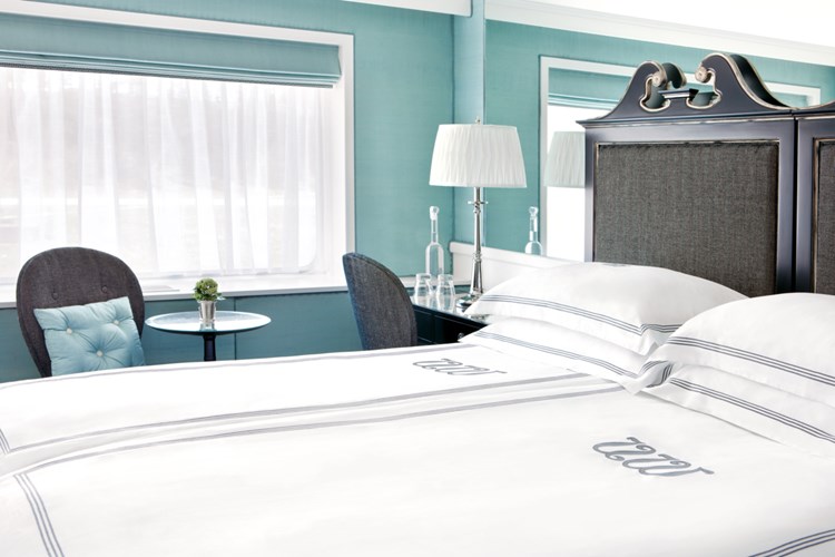 The Princess Suites feature larger bathrooms (dual sink, a bathtub shower, WC) and a larger lounge area (with a floor-to-ceiling window. The French balcony windows are right in front of the bed.