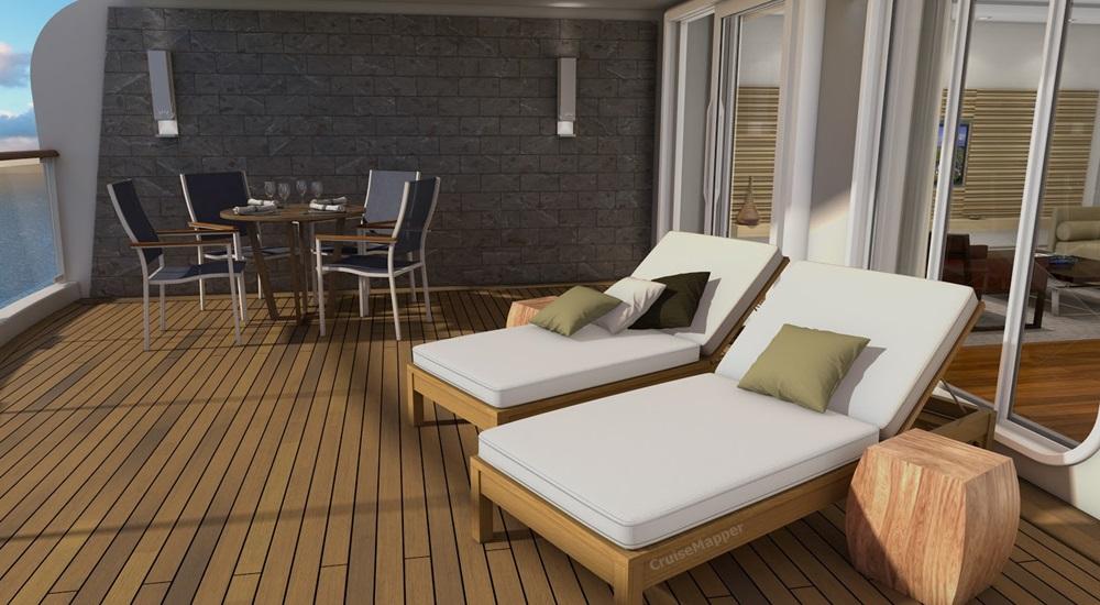 The only one Owner's Suite (category OS, deck 7 location forward-starboard) is the ship's largest accommodation (sized 1320 ft2 / 123 m2, with additional 175 ft2 / 17 m2 balcony). The Owners Suite has a living room (couch, coffee table, chairs, wet bar), separate dining area (6-seat dining table), walk-in closet, powder room, separate bedroom (king bed, walk-in closet), separate boardroom (meeting room with locked doors, 10-seat table, guest bathroom, butler's pantry with a small oven), master bathroom (double sink vanity, large power-shower), oceanview sauna room (unique feature). The large veranda is furnished with 2-seat wooden loungers (cushioned), table, 2 chairs. Among the Suite's perks are custom stocked mini-bar, early check-in (at 11 am), guaranteed dinner reservations, complimentary laundry, dry-cleaning, pressing, shoeshine.