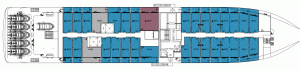 Ocean Explorer cruise ship deck plan has a total of 77 staterooms for 162 passengers (max capacity) served by 99 crew/staff (53 crew cabins), 6 passenger decks (accessible via 1x elevator), 2x sundecks (lower and upper), 3x restaurants, open-deck/alfresco dining, piano bar, 2-deck observation lounge, show lounge (lectures theater), wellness (gym and spa) facilities, shop, library, changing facilities (mud room serving Zodiac landings), 20x Zodiac boats, swimming pool, 2x Jacuzzies, pool bar.